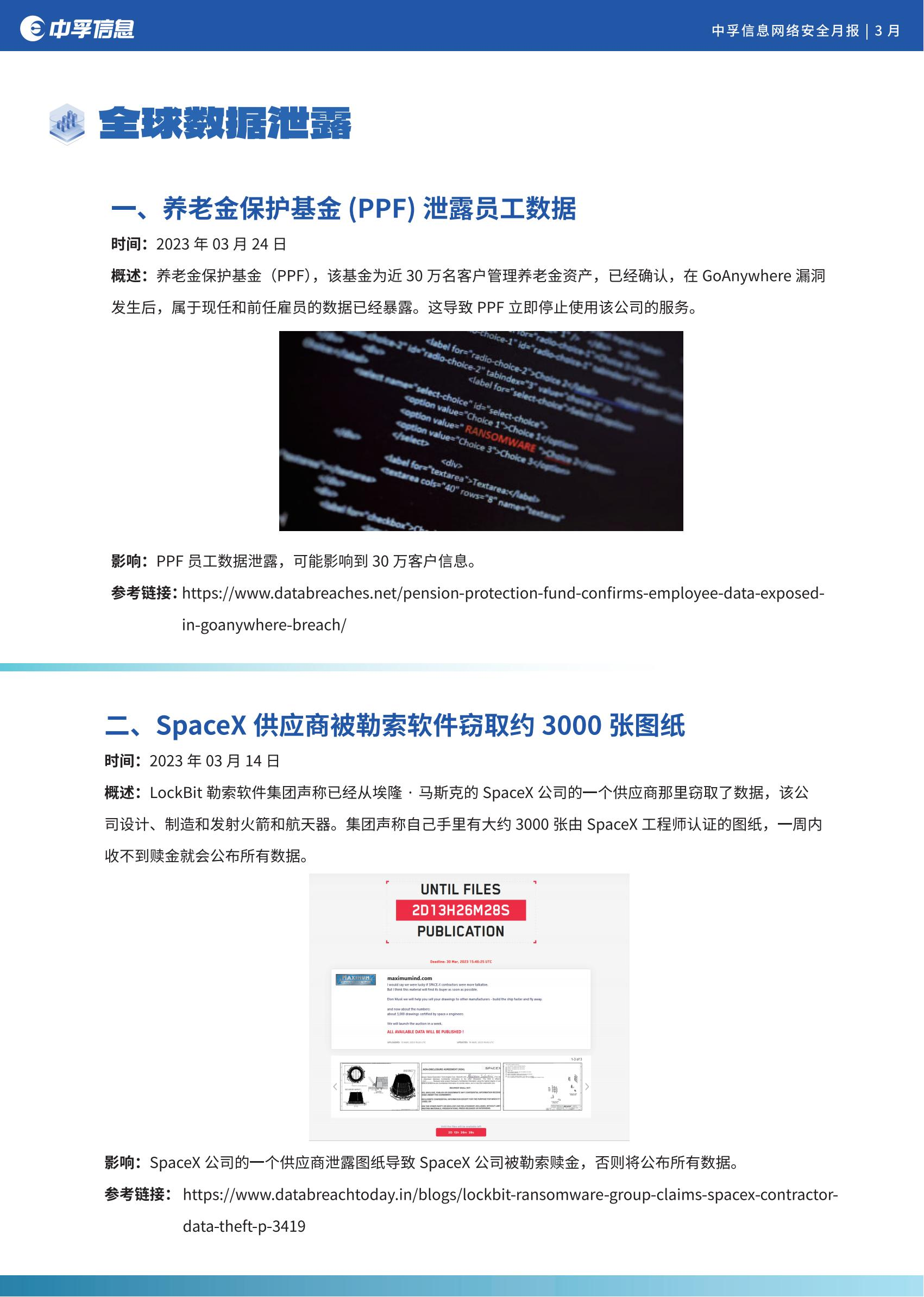 此外,本月值得关注的还有科技、金融、政府等行业的数据泄露事件,其中个人隐私仍是热点,分别是:SpaceX供应商被勒索软件攻击,导致约3000张图纸被窃取;金融贷款机构Latitude Finance 的30万客户信息被盗;OpenAI 的 ChatGPT 首次遭遇了重大个人数据泄露事件;Play勒索软件泄露了奥克兰市10GB数据。